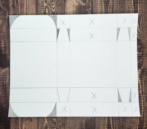 Cut according to the template: Eliminate all squares and rectangles with an "X". Miter the 4 tabs as shown. Round the corners as shown.